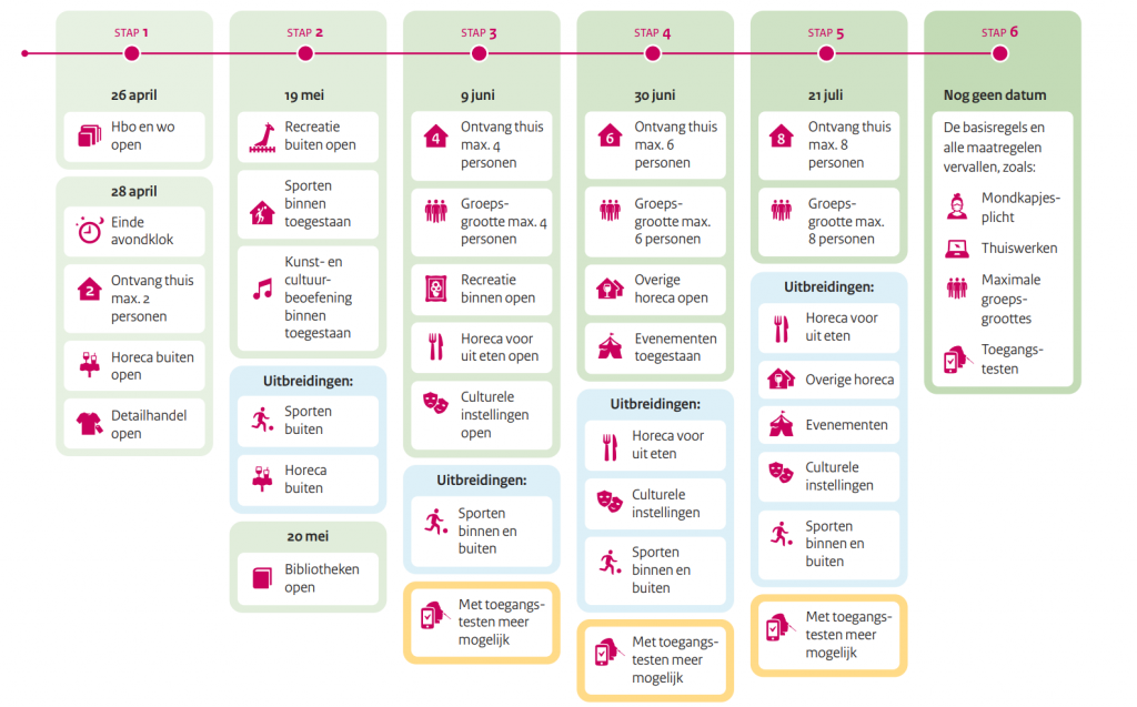 Het openingsplan vindt u in onderstaand overzicht. De link naar de maatregelen vindt u hier.